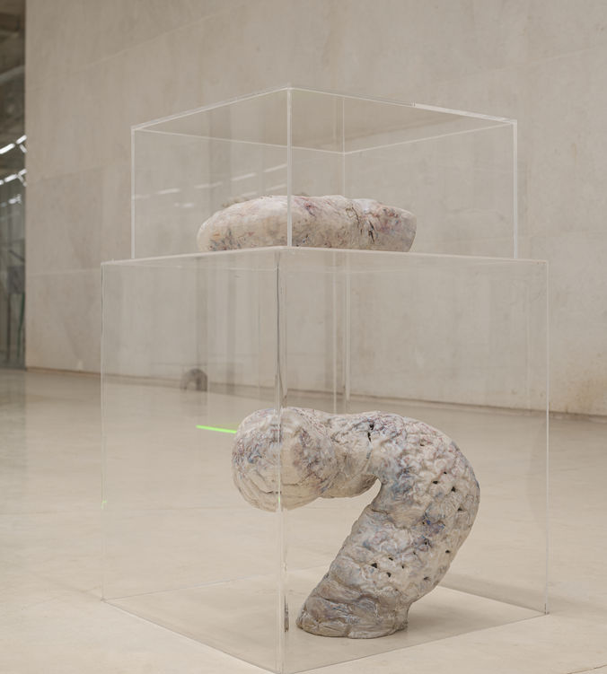 The various sculptures that comprise the project were created following a complex interaction with the artificial intelligence program “Midjourney”. The two-dimensional images provided by the software were translated back into the phsical world through manual sculpting techniques. The bizarre figures that emerged are a result of synthesis between sculptures like Michelangelo’s “Pieta” and “Laocoon and his Sons”, creating something entirely new. The sculptures presented in the project are made exclusively from clay and coated with Terra Sigillata, a traditional ceramic coating method that gives them a marble-like appearance. The result is a sculptural array of simulacra, physical replicas that are familiar yet strange within an altered reality.